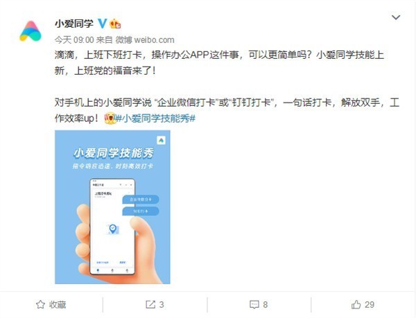 今天上午消息称,小爱同学官方微博表示,小米手机的小爱同学新上线了工作打卡功能,可实现上班、下班打卡,操作办公App。具体操作是,只要对手机中的小爱同学说“企业微信打卡”,或者“钉钉打卡”,就能够完成打卡。