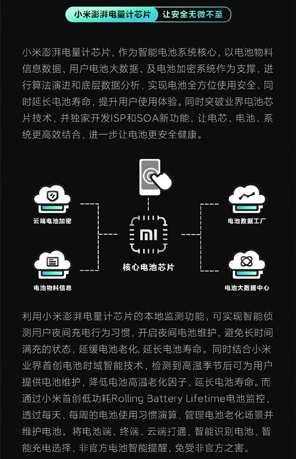 这颗芯片是小米新型电池得以实现技术突破的重要组成部分。官方披露,小米澎湃电量计芯片,作为智能电池系统核心,以电池物料信息数据、用户电池大数据及电池加密系统作为支撑。