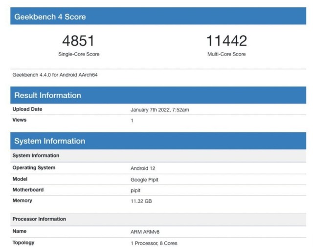 Pixel Fold的Geekbench 4单核跑分4851,多核跑分11442,配备12GB内存,搭载Android 12。
