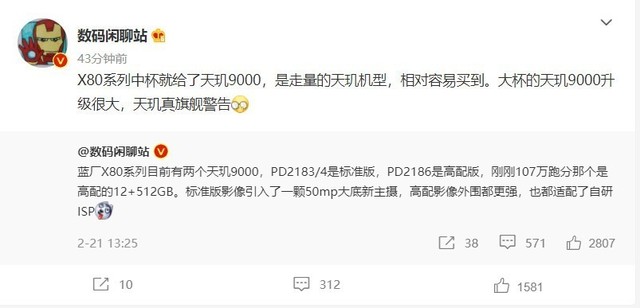 值得注意的是,该博主之前爆料,vivo X80系列目前有两个天玑9000,PD2183/4是标准版,PD2186是高配版,刚刚107万跑分那个是高配的12+512GB。标准版影像引入了一颗50mp大底新主摄,高配影像外围都更强,也都适配了自研ISP。