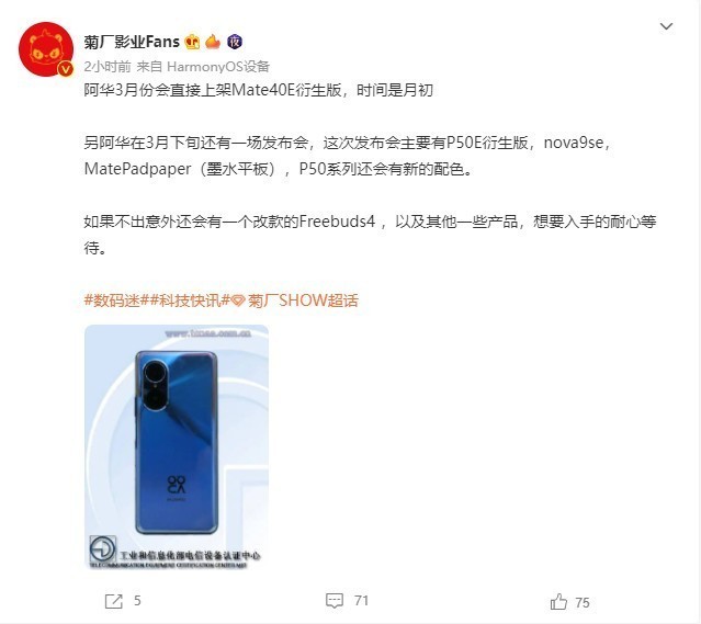 另华为在3月下旬还有一场发布会,这次发布会主要有P50E衍生版,nova9se,MatePadpaper(墨水平板),P50系列还会有新的配色。