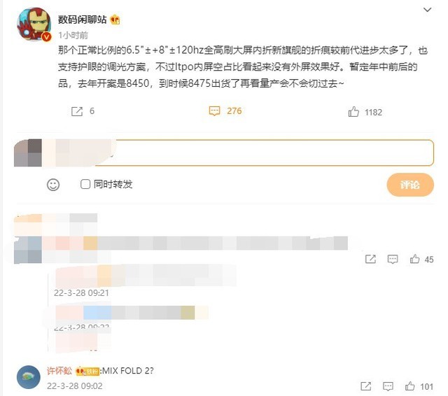 今天,数码博主@数码闲聊站发文表示,那个正常比例的6.5"±+8"±120hz全高刷大屏内折新旗舰的折痕较前代进步太多了,也支持护眼的调光方案,不过ltpo内屏空占比看起来没有外屏效果好。暂定年中前后的品,去年开案是8450,到时候8475出货了再看量产会不会切过去~