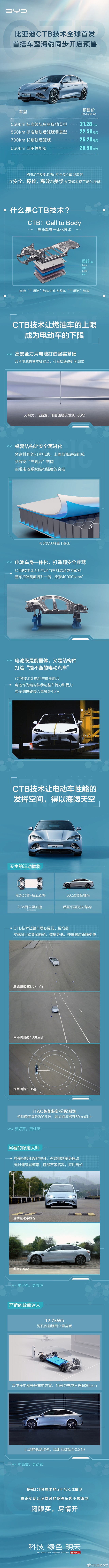 比亚迪CTB电池车身一体化技术,让电动车的安全、操控、高效和美学等性能得以“海阔天空”。首款搭载CTB技术的e平台3.0车型海豹正式开启预售。