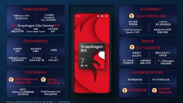 第一代骁龙7移动平台使用ARM V9架构,采用了与骁龙888同款的Adreno 660 GPU,可以提供卓越的游戏体验;搭载了全新升级的Spectra 580 ISP,拥有2亿像素照片的拍摄能力;第七代高通AI引擎可以为影像提供充足的算力。