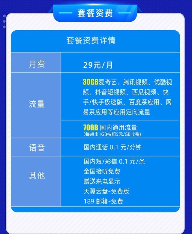 此卡激活当月赠送30元话费,套餐激活后立即有效,全国接听免费 赠送来电显示 通话0.1元一分钟,送天翼云盘免费版,29元1月月租 送70G通用流量+30G定向流量,定向流量包含国内热门应用及游戏,无乱七八糟的额外服务,套餐有效期20年,非常适合长期稳定,对流量需求有比较高的人士。