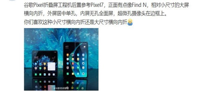 歌 Pixel 折叠屏工程机(Pixel Notepad)的后置模组类似谷歌 Pixel 7,正面有点像 OPPO Find N。该机将采用尺寸相对较小的大屏横向内折设计,外屏为居中单孔。