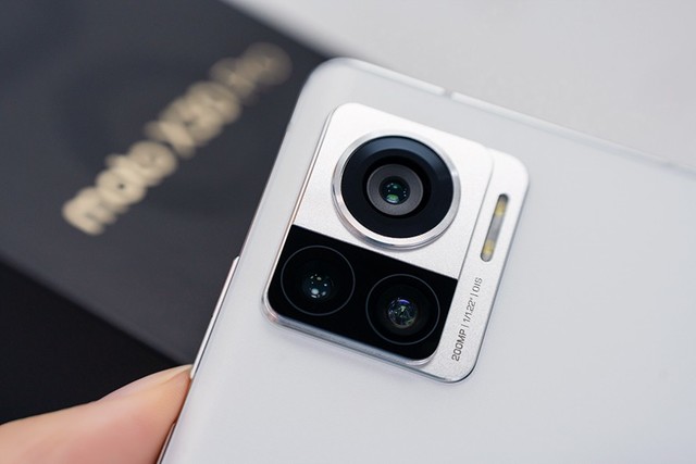 机身的背面配色以白色为主,丝绒AG玻璃后盖确保了裸机使用时不易沾染指纹,中间依旧是摩托罗拉传统的M字母logo标,底部区域有motorola的字样,后置摄像头模组位于左上角区域,模组外框是金属架构,后置三摄呈三角形排列,主摄的尺寸造型看起来就很大,金属框架上也印有主摄的尺寸和像素大小,1/1.22英寸,2亿像素并带有OIS光学防抖,下文的影像介绍我们也将重点看一下这颗2亿像素超大底主摄的表现。