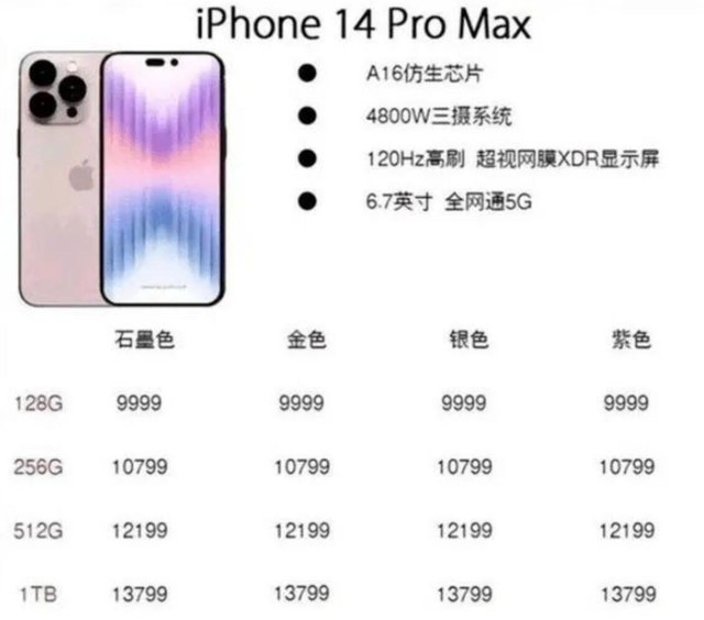 新的爆料消息显示,iPhone 14 Pro Max将提供石墨色、金色、银色和紫色四种配色,上市后或许还会增加一些其他配色版本。同时,这款产品提供128GB、256GB、512GB和1TB存储选择,售价分别为9999元、10799元、12199元、13799元。