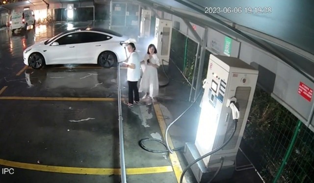 特斯拉传来了爆炸声,女车主赶紧躲开并请求旁边的大哥帮忙。管理人员立即关闭了充电桩,拔下了充电枪,车辆停止了冒烟,但仍有烧焦味道弥漫。