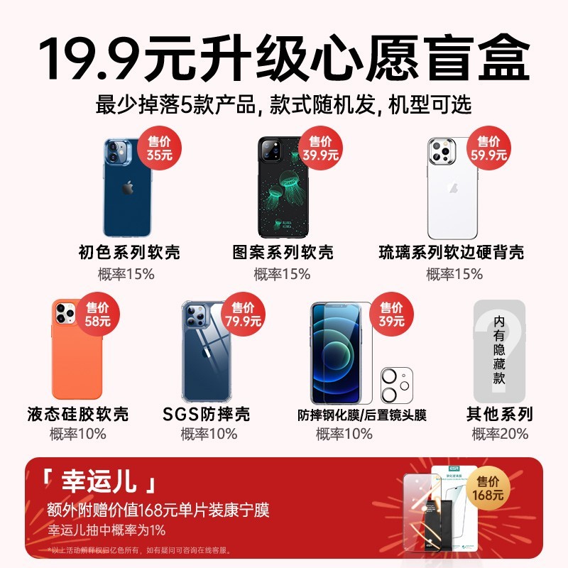 亿色SR系列盲盒手机壳膜,专为iPhone XR/11/12/13/14等系列机型设计,包含2个款式随机搭配,让你每次拆封都充满惊喜!采用高品质材质,轻薄耐用,完美贴合机身,保护手机同时展现个性风格。现在天猫特惠活动正在进行中,原价9.9元的商品,现特价至7.9元,还可叠加满11减...