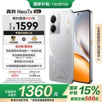 realme Neo7x搭载第四代骁龙6性能芯,带来强劲动力与高效能耗表现,6000mAh超大容量电池提供持久续航,轻松应对日常使用和长时间娱乐需求。配备OLED电竞直屏,高刷新率和出色色彩表现让游戏和观影体验更加震撼。12+512大内存组合,满足多任务处理和海量存储需求。银翼机甲设计,科技感与美感兼备。现在京东活动价仅需1599元,参与政府补贴满1件打85折并晒单返30元京豆,最终到手价低至1329.15元,近期难得的好价不要错过!