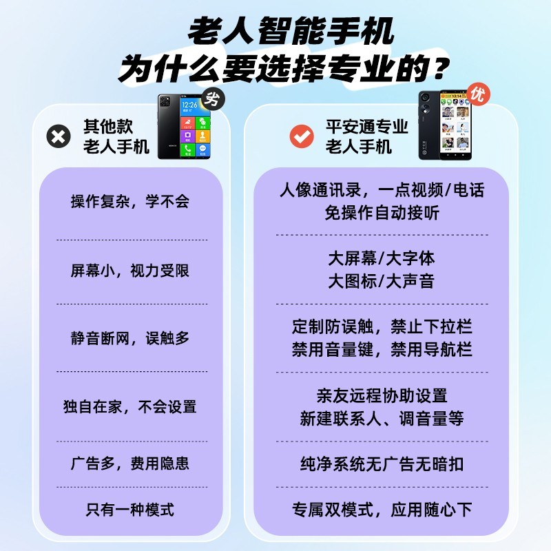 专为老年人设计的平安通老人手机智能机,现正限时优惠中!原价988元,参加新势力周满减活动立减200元,到手仅需788元。这款手机采用大图标设计,操作简单直观,特别适合不识字或文盲老人使用;一键呼功能方便快捷,支持视频通话和自动接听,让沟通更轻松无障碍。全网通、大屏幕、大字体和超大音量设计,充分满足老年人日常使用需求。如果您或家中的长辈需要一部简单易用的智能手机,这款平安通老人手机将是您的不二之选,刚需可入,近期好价不容错过!