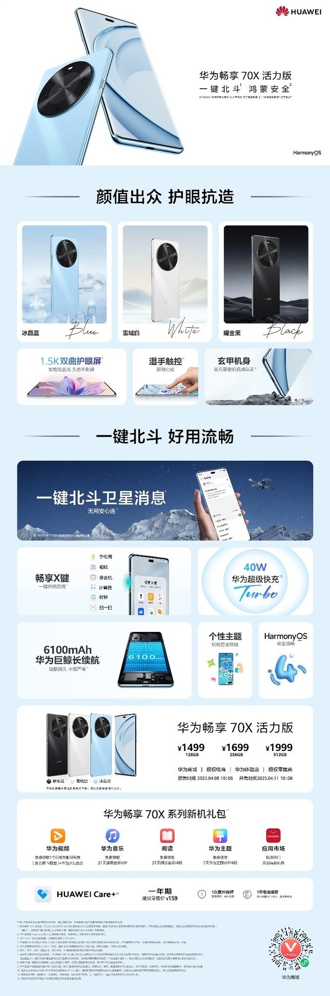 综上所述,华为畅享70X活力版以超能续航、超强通信、超便捷体验、超可靠机身,以及更加丰富易用的交互体验,无疑能够成为千元机市场的佼佼者。目前,这款千元全能的北斗鸿蒙手机已正式开启预售,售价1499元起,国补最高直降300元,最低到手价1274元起。不仅如此,2025年4月11日至2025年5月11日,华为畅享70X活力版新机用户,可通过我的华为app-新机权益-华为畅享70X系列新机礼包-畅享无忧大礼包领取礼遇,包含延长1年保修和1年电池焕新,更多服务权益详情可通过我的华为app-服务-权益查询了解。