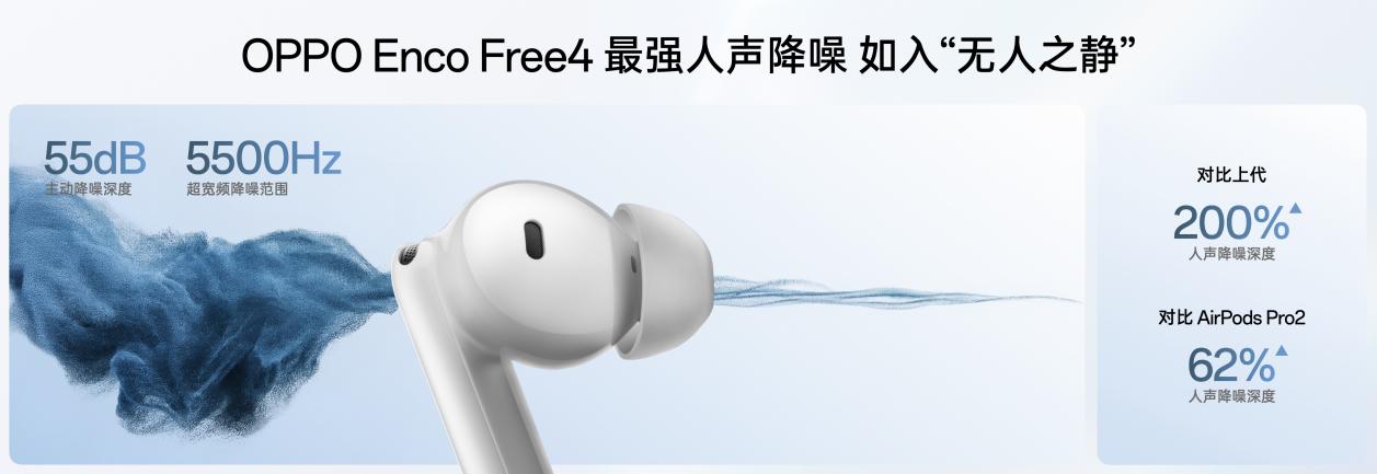 OPPO Enco Free4在降噪性能上实现再次突破,搭载超强人声降噪系统,降噪深度提升到55dB,有效降噪频宽达到5500Hz,带来覆盖面更广的降噪体验,轻松覆盖通勤、办公等各类日常生活场景,尤其针对50-3000Hz的常见人声频段进行了深度优化,在该频段内降噪表现达到行业TOP水准,平均降噪效果优于AirPodsPro 2,相比OPPO Enco Free3提升200%,让用户在复杂的嘈杂环境中时刻保持平静与专注。