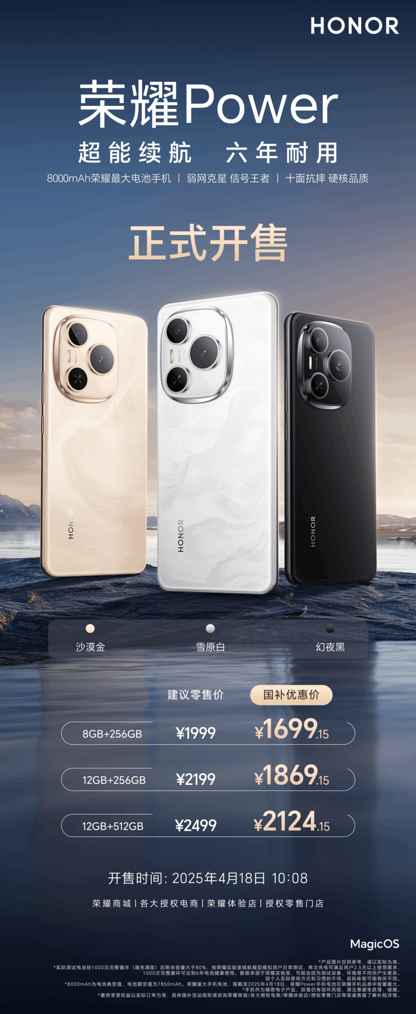 4月18日10:08,荣耀Power正式开售,国补后1699元起的价格极具吸引力。其凭借出色配置、亲民价格和越级体验,实现“超长续航、无界通信、户外美学”三重突破,深受轻户外群体的青睐。