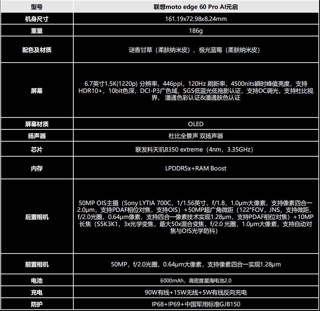 值得一提的是,moto edge 60 Pro AI元启不仅外观设计出众,还通过了中华人民共和国国家军用标准GJB 150的14项全能认证,这意味着它经过了16项极端条件测试的严苛考验,包括温度变化、强烈冲击、深度防水以及抗腐蚀性等多个维度。再加上IP68/IP69防尘抗水与湿手触控的支持,moto edge 60 Pro AI元启无论在日常生活还是极端环境中,都能为用户提供持久、可靠的使用体验。