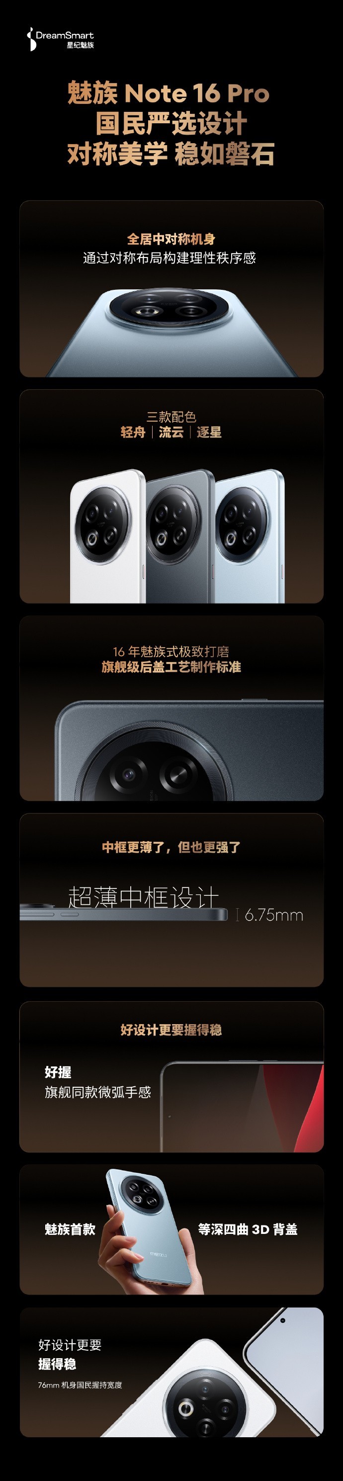 在设计美学上,魅族Note 16 Pro采用对称美学设计,全居中对称机身搭配1.45mm视觉四等边直屏与八角形镜头模组,配合双面2.5D微弧玻璃,兼具美感与握持手感。其拥有轻舟、流云、逐星三款配色。Note 16则采用直角金属中框搭配红色电源键,提供“皓月白”“丹霞红”配色,设计灵感源自中华千年藻井艺术。
