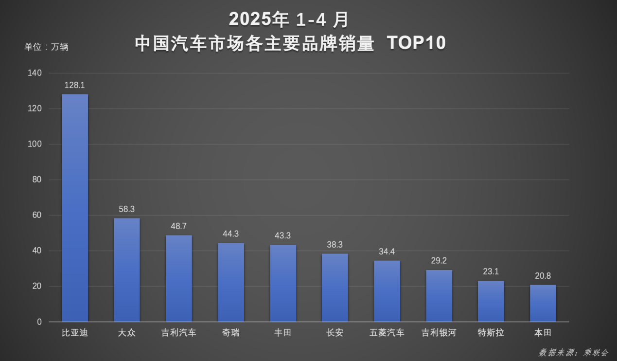作为季度承上启下的关键节点,4月比亚迪汽车再次以34.7万辆的成绩,位列中国汽车市场各主要品牌销量TOP10第一,几乎等同于第二至四名之和;比亚迪汽车1-4月累计销量超128万辆,同比增幅显著,呈现出强劲的增长动力与市场统治力,展现头部品牌势能。