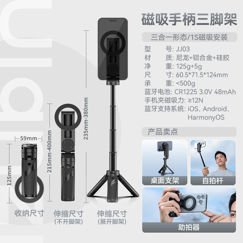 优篮子 JJ03迷你磁吸手机支架是一款专为iPhone设计的多功能自拍神器,支持Magsafe磁吸快拆,安装稳固便捷,适用于各种拍摄场景。内置蓝牙手柄可远程操控手机拍照,搭配三脚架使用更稳定,是旅游、直播、日常记录的理想助手。产品小巧轻便,易于携带,满足多角度拍摄需求。
