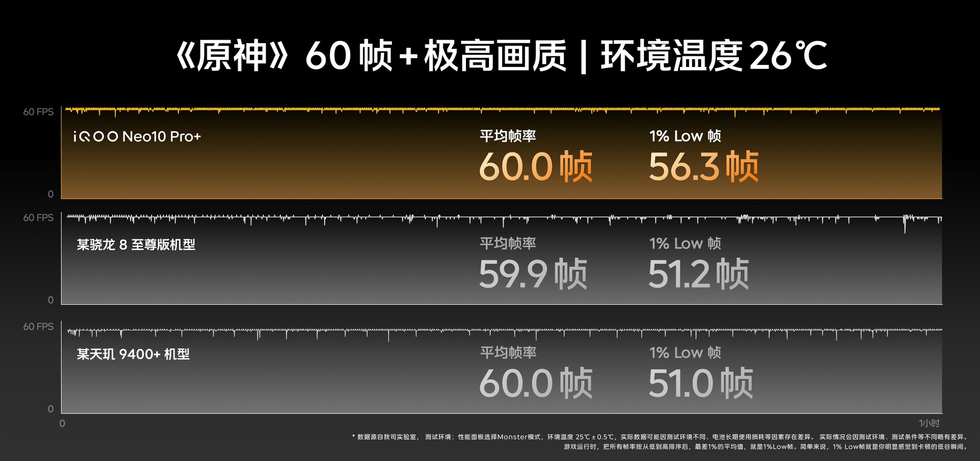 《原神》因其精美的画面、复杂的场景和大量的角色技能特效,向来被视为检验手机性能的“重载代表”。在此次测试中,iQOO Neo10 Pro+在2K屏幕分辨率下运行《原神》,依旧交出了一份令人瞩目的成绩单。其平均帧率稳定在60帧,这意味着在游戏过程中,画面能够以极高的流畅度进行呈现,无论是角色的动作、技能的释放,还是场景的切换,都丝滑顺畅,没有明显的卡顿感。