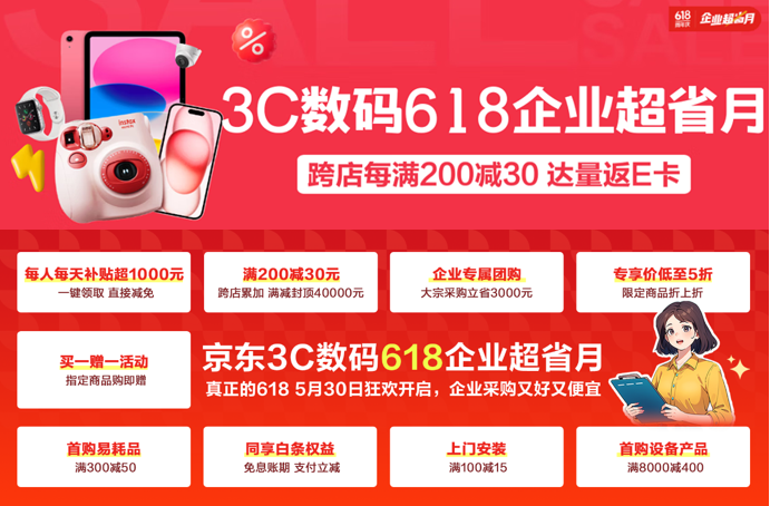 5月30日,京东“3C数码618企业超省月”全面开启,打开京东APP搜索“企业采购618”可直达会场,开启质优价廉、高效便捷的办公用品采购体验吧!