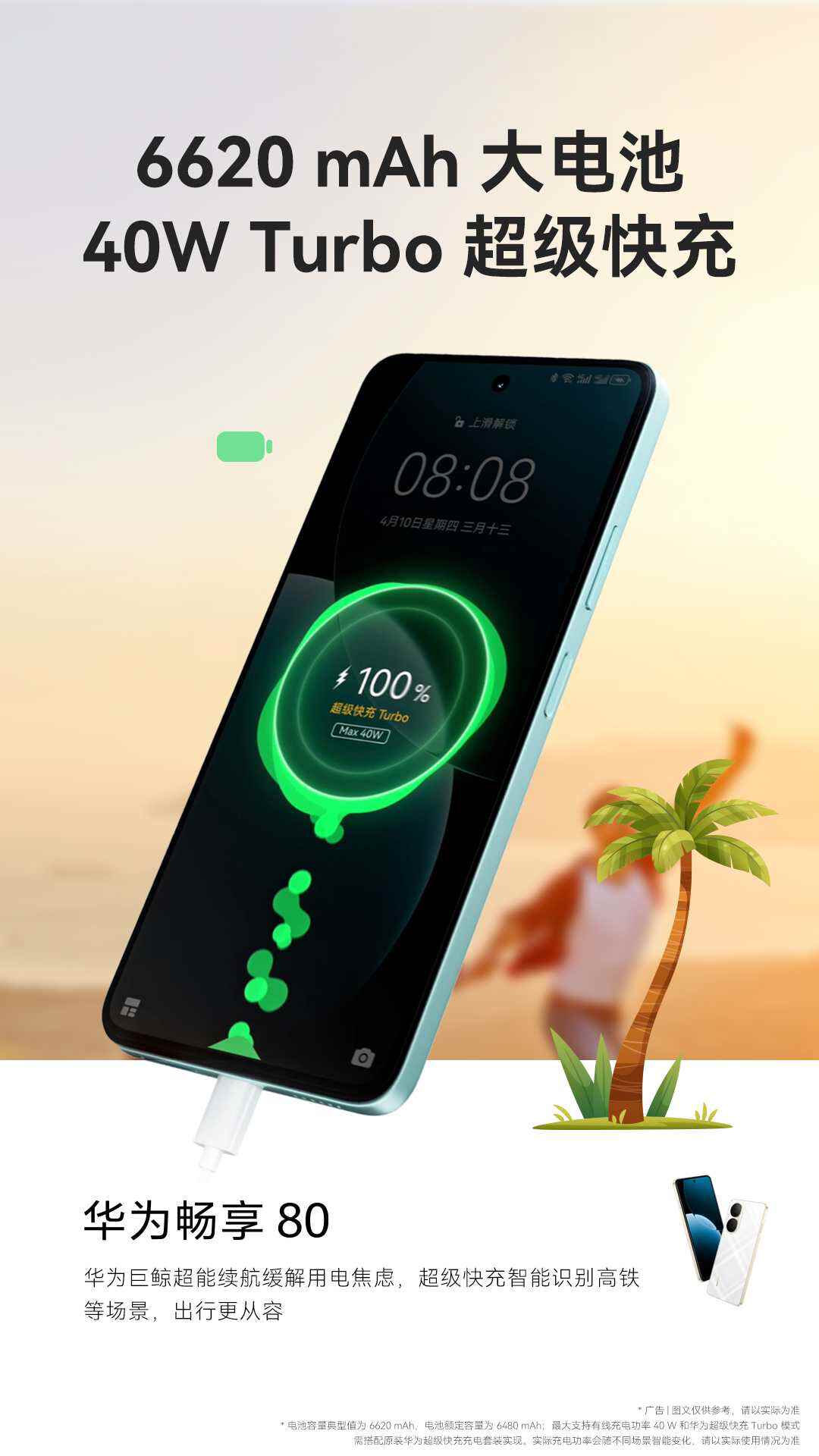 不止通信能力出众,长效续航也是华为畅享系列机型的一大卖点。其中,华为畅享 80搭载了6620mAh硅碳负极大电池,并支持40W华为超级快充Turbo,而华为畅享 70X和华为畅享 70X 活力版则搭载了6100mAh巨鲸电池+40W超级快充Turbo,三款机型均展现出超强续航能力,不仅能够轻松满足全天候重度使用需求,对于一些轻度用户甚至能够实现“两天到三天一充”。