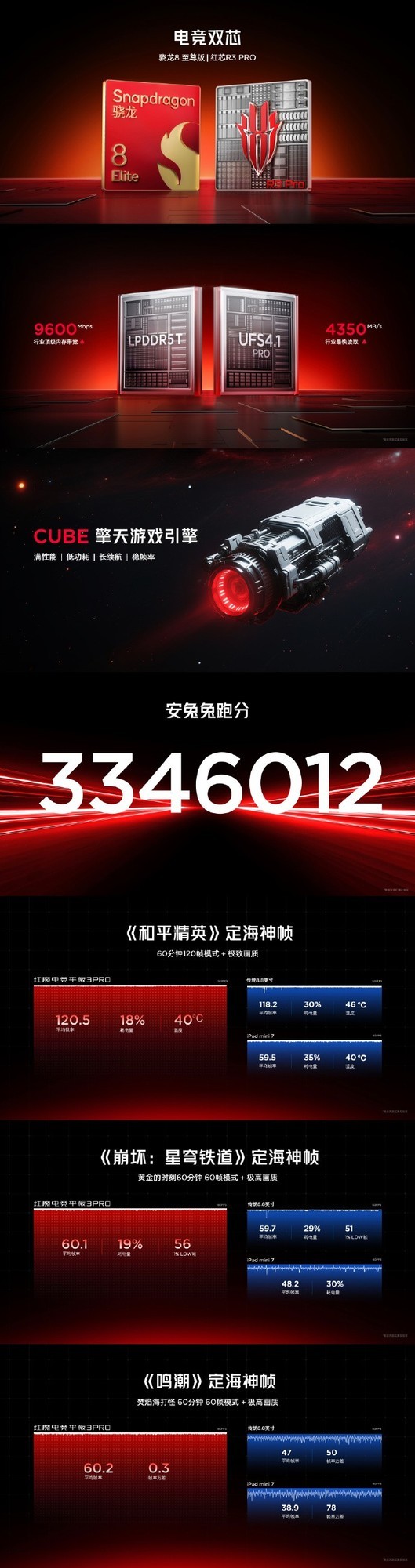 性能方面,红魔电竞平板3 PRO搭载骁龙8 Elite芯片搭配LPDDR5T及UFS4.1 Pro,结合自研CUBE擎天调度引擎,性能表现领先。ICE魔冷散热系统3.0采用双层夹芯VC、液态金属及20000r/min驭风2.0风扇,13层散热设计助力性能释放。