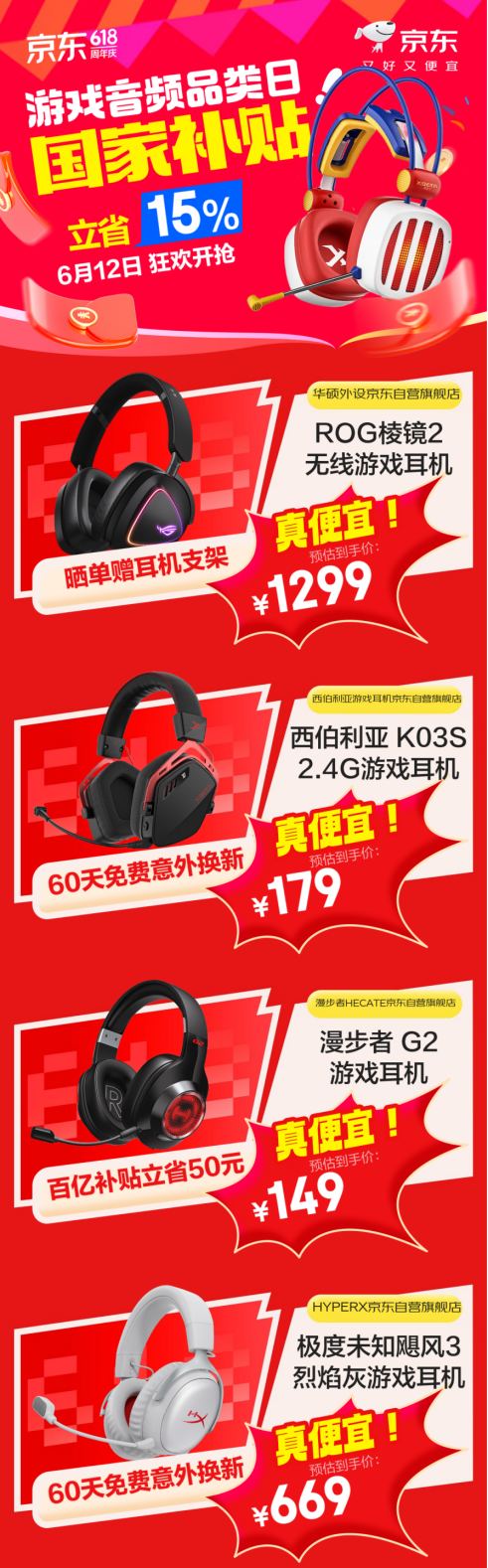 京东618的抢购热潮一波接一波,6月12日京东携游戏音频品类日惊喜登场,为广大游戏玩家带来众多爆款游戏耳机音箱。无论是潮流科技感外观、极致音效、舒适的佩戴触感,还是超长的续航能力,玩家都能在这里找到心仪的产品,更有国家补贴立省15%、百亿补贴、晒单加赠好礼等超值优惠同步降临。打开京东APP搜索“音频省上加省”,开启你的游戏新征程!