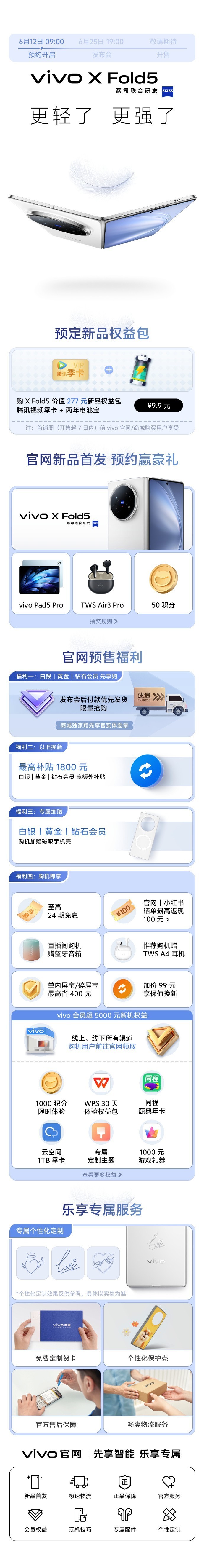 6月12日09:00开启预约,6月25日19:00举办发布会,开售时间待定。福利方面亮点颇多,9.9元可预定价值277元新品权益包,含腾讯视频季卡与两年电池宝(首销周官网/商城购机享);参与预约有机会抽vivo X Fold5、平板、耳机等好礼。预售时,白银/黄金/钻石会员享优先发货、限量抢购及专属加赠,以旧换新最高补1800元,购机还可享24期免息、晒单返现、直播间赠礼等福利,超5000元购机的会员,另有积分、WPS体验包等多项权益。