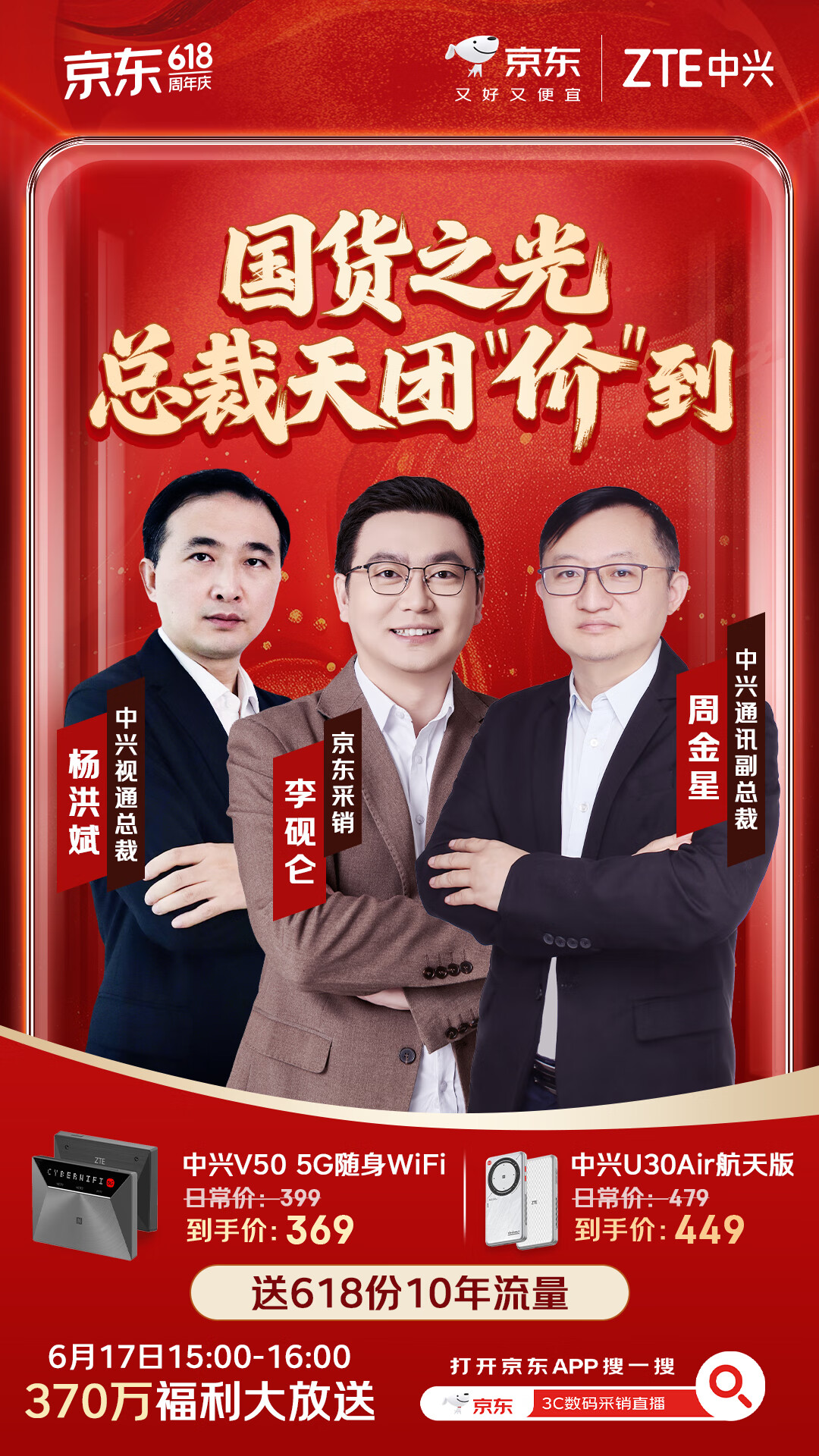 京东618携手中兴通讯宣布再度开启“十年有约”特别活动,中兴通讯副总裁、移动互联产品部总经理周金星和中兴视通总裁杨洪斌将在6月17日下午3点做客京东3C数码采销直播间,并为消费者带来价值500万元的福利大放送,包括购买中兴U30Air和V50随身WiFi送免费10年流量的惊喜福利,共有618个名额,诚意满满,致力于让每一位消费者都能轻松参与,打造一场属于“流量发烧友”的年度狂欢盛宴。打开京东搜索“3C数码采销直播间”,关注6月17日下午的国货之光总裁天团“价”到的直播活动,即可参与。